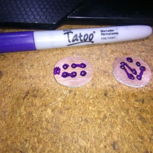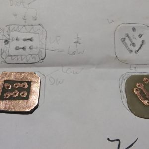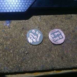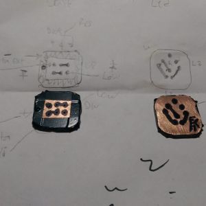 Ya que las tablillas estában límpias y el cobre brillante, hice un diseño en papel a mano alzada de como quedarían las pistas en ambas tarjetas. La superior alberga los LEDs de 5mm y la inferior los componentes para el cambio de intensidad. Entre ellas se conectan en paralelo las ocho tablillas con los LEDs 5050. Elegí hacerlo a mano para que fuera rápido, así que después del diseño, perforé la PCB, dibujé las pistas con un Sharpie y las pistas gruesas de al rededor se cubrieron con cinta de aislar. Se lavaron muy bien después de que salieron del FeCl3 y se procedió a soldar componentes, primero la tarjeta de los LEDs de 5mm y fue probada, luego se comenzó a poner una por una las 8 tarjetas laterales con LEDs 5050 no sin antes conectar las dos placas entre sí. La pista gruesa inferior es la de tierra y la superior la de voltaje, el hecho de que sean gruesas y anchas, facilita la soldadura y la disipación de calor una vez armado el conjunto. Posteriormente se conectaron sus respectivos alambres para la terminal del socket y fue probado. Para darle rigidez, la base del foco se pegó a la PCB con Resistol 5000 automotriz, quedando listo el foco para ser probado en el auto.