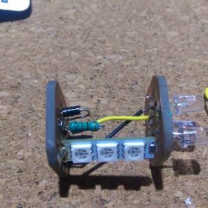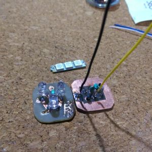 Es un diseño muy sencillo y funcional, yo quería que diera mas luz que los Pilot normales, así que decidí usar ocho tarjetitas de las de 3 LED 5050 en una formación casi circular para que iluminen y se reflejen en la zona de «espejos» interna de la calavera del auto, y añadí una tarjetita de 3 LEDs de 5mm de los que venden en Steren (ya los tenía en stock jaja).
